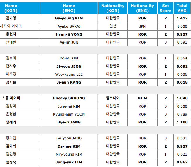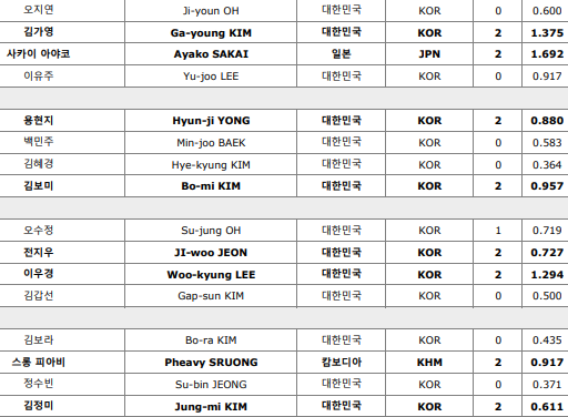 사카이 아야코가 1.692로 에버리지가 가장 높았네요. 이유주선수는 잘 치고도 탈락해서 안타깝네요. 상대가 너무나 잘 치면 어쩔 수 없는 거 같아요.