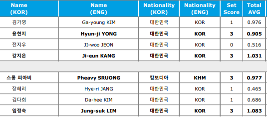 ‘캄보디아 특급’ 스롱 피아비는 직전 투어인 개막전 32강전서 발목을 잡힌 장혜리에 설욕했다. 첫 세트를 단 3이닝만에 11:0 기선을 제압했고 2세트도 11:4(14이닝)로 따냈다. 3세트를 17이닝 만에 10:11로 패했으나 4세트를 11:5(11이닝)로 따내며 승부에 마침표를 찍었다.